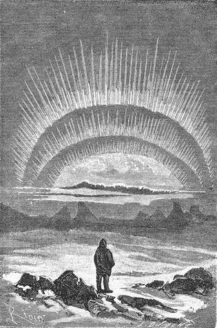 La maravillosa luminosidad del poloHatteras, pues, aparece en torno a la página cien de la novela que lleva su nombre. Hasta entonces, el libro tenía sus concomitancias con el previo título de Verne, Cinco semanas en globo: la atención centrada sobre los preparativos de una expedición que se presume audaz, el decurso de las primeras incidencias de la travesía y la intercalación de pasajes de contenido didáctico a cargo del «sabio» del viaje, el doctor Clawbonny. A partir de entonces, sin embargo, la novela se convierte en la historia de una obsesión, y esta circunstancia la convierte en un título prácticamente sin parangón en la obra verniana. Cierto que en esta no tardarán en aparecer libros y personajes animados por idénticos parámetros que los caracterizan a Hatteras, pero en ellos la obsesión no es el único motor de historia y de narración: en Veinte mil leguas… el personaje de Nemo es temperado por la propia peripecia personal de los tres náufragos que alcanzan el Nautilus; en Viaje al centro de la tierra, su propia condición de relato iniciático en estado puro provoca que incluso la obstinación de Lidenbrock quede en segundo plano ante la progresiva fascinación de su sobrino Axel por la aventura que están protagonizando…