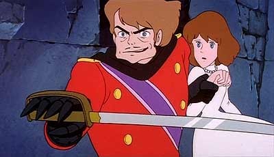 Sí es verdad que, por única vez en la carrera del autor, existe un villano total, irredimible, y que por ello deberá pagar sus maldades sin cuento con su muerte. Ahora bien, que sea un villano unívoco no lo convierte en unidimensional. Si hubiera sido un personaje de carne y hueso, diríamos que la interpretación del actor lo hubiera rescatado de ese esquematismo (uno piensa en que James Mason lo hubiera bordado). Pero puesto que es de dibujos animados, es evidente que su atractivo se debe al trabajo de Miyazaki y sus colaboradores. El conde de Cagliostro es un villano elegante, que rara vez se rebaja a la ira descontrolada o la prisa antes de pensar, cuyo castillo está repleto de obras de arte (en las paredes se descubre nada menos que el retrato de Bellini de El dux Loredan —¡cuyos ojos esconden dos agujeros para poder espiar el interior de la sala donde está colgado!— o El juramento de los Horacios, de David). Miyazaki lo rodea de una muy acertada aureola gótica: cuando parece que ha acabado para siempre con Lupin, remarca su triunfo ante la princesa Clarisse abriendo su capa como si fuera un vampiro (el forro, por supuesto, es escarlata) y el cortejo nupcial no puede ser más siniestro, con esa guardia de honor de encapuchados con cucurucho (como el Ku-Klux-Klan, pero en negro, o nuestros nazarenos). Incluso, y en un muy americano detalle digno de la entrañable «teoría de la conspiración», Lupin descubrirá que la familia Cagliostro, de la que en el fondo el conde sólo es un dignísimo representante, con sus activividades falsificadoras, ha sido responsable oculta de numerosos cataclismos de la historia, de la caída de los Borbones y el estallido de la Revolución Francesa al crack de 1929.