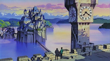 El castillo del conde, donde transcurre buena parte de la acción —sobre todo su maravilloso tercio central, que muestra las andanzas de Lupin por su interior—, no es sino la proyección de su tenebroso ser: un lugar enorme, casi inexpugnable, cuyos muros ciclópeos, sin embargo, no revelan nada de su interior puesto que éste se halla atravesado por un dédalo de pasadizos y galerías, en gran parte sumergido bajo el agua, de enormes pozos y subterráneos de pesadillo donde el ladrón se tropieza con una dantesca panoplia de esqueletos y cadáveres acumulados a lo largo de los siglos, muertos y olvidados bajo toneladas de piedra. Un grupo, en apariencia innúmero, de sicarios tenebrosos puede deslizarse por cualquier rincón de esos subterráneos en busca de intrusos indeseados. Es memorable su diseño, como si fueran ninjas enfundados con letales extremidades metálicas, que se deslizan en el más completo silencio. Frente a ese fascinante escenario, Miyazaki no olvida representar su doble especular exacto: el antiguo castillo real, en ruinas y abandonado desde un incendio anterior, pero que ha acabado convirtiéndose en un apacible escenario donde la piedra se ve invadida por la vegetación, entablando una simbiosis con la naturaleza que anticipa, claro, la aparición final de la ciudad romana bajo las aguas, y que al mismo tiempo evoca otro espacio maravilloso del inminente universo miyazakiano: la ciudad de las nubes de Laputa, que cobrará vida en El castillo en el cielo (1986).