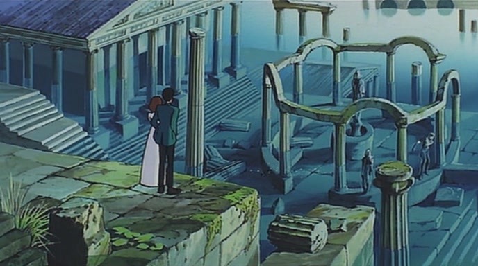También se encuentra alguna escena aérea, si bien mínima, cuando los protagonistas huyen de la torre del castillo de Cagliostro en un helicóptero (deliciosamente anticuado) que está a punto de costarles la vida. Y si tampoco hay un claro mensaje ecologista que defienda la necesidad de un equilibrio entre la humanidad y la naturaleza, en el fondo el bonito final de la película [spoiler] —el tesoro tras el cual iban tanto Lupin como su antagonista no era sino una antiquísima ciudad romana encerrada bajo las aguas del inmaculado lago del país— supone un esbozo del mismo en el sentido de que reclama la adecuada fusión entre esos dos elementos que deben convivir. La esencia de Miyazaki sí se encuentra en el tono, en la atmósfera, en esa capacidad para hacer que la acción parezca suspendida en una eterna calma, incluso en sus momentos más dramáticos, en la facilidad para el dibujo de personajes, en su sentido ético, aquí encarnado no en sus habituales personajes adolescentes sino en ese entrañable equipo de buscavidas a los que, en teoría, mueve tan sólo el material dinero pero que, en cada una de sus acciones, desbordan lealtad, nobleza, humanidad.