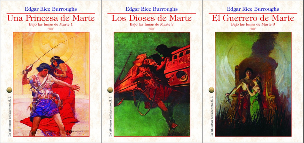 La estupenda editorial madrileña La Biblioteca del Laberinto, haciéndose eco del centenario del ciclo, ha publicado hace pocos meses esas tres primeras novelas, con el subtítulo general de Bajo las lunas de Marte, así como una bonita edición a todo color de las planchas dominicales que sobre el mismo personaje realizó el hijo del propio Burroughs, John Coleman Burroughs, a principios de los años 40. Sobre esos tres primeros libros, puesto que no he leído ninguno de los demás (PulpEdiciones publicó una polémica edición de todos ellos en la década pasada), voy a efectuar mi comentario sobre el personaje.