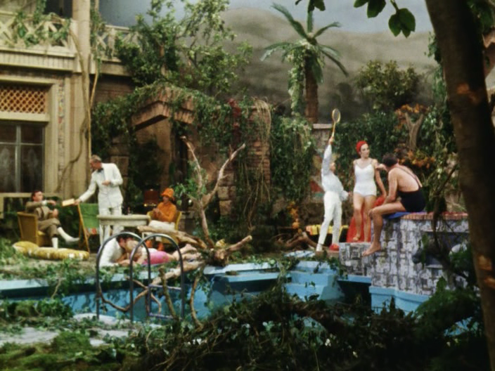 La lujuriosa piscinaLa historia está datada aquí con precisión. La primera anotación en el cuaderno es del día 11 de enero de 1935, y la última será escrita justo cuatro meses después, el 10 de abril. Entre medias se desarrolla la febril odisea del prófugo. El arranque del film es memorable: la cámara (subjetiva, desde el punto de vista de aquél) se interna en una construcción de diseño moderno que aparece fabulosamente medio sepultada por la vegetación. Pues Bonnardot respeta la situación de la isla en tierras tropicales, llamada Villings, en las Ellice, a donde llega el prófugo, naufragando en una playa singularizada por lo que parece una batería de cuatro cañones clavados en la arena (luego sabremos que son las máquinas mediante las cuales Morel extrae su energía de las mareas). El lugar es tal como señala el libro de Bioy: una costa de acantilados, una plataforma yerma sobre ellos y unas construcciones abandonadas al borde de una selva lujuriosa (en la banda sonora resuena un son de timbales, como si alguna tribu salvaje se escondiera en su interior).