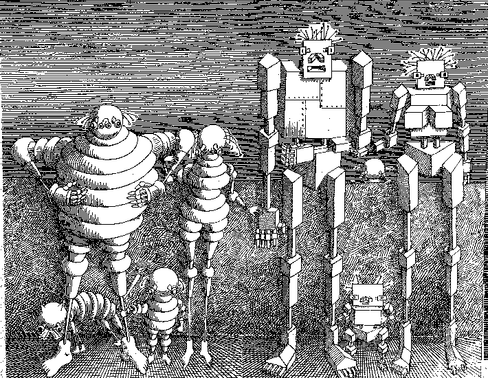 Las excelentes ilustraciones que aparecen en este comentario pertenecen a Daniel Mroz (1917-1993) , excelente diseñador y dibujante polaco, y fueron realizadas para la edición original polaca de Ciberíada.