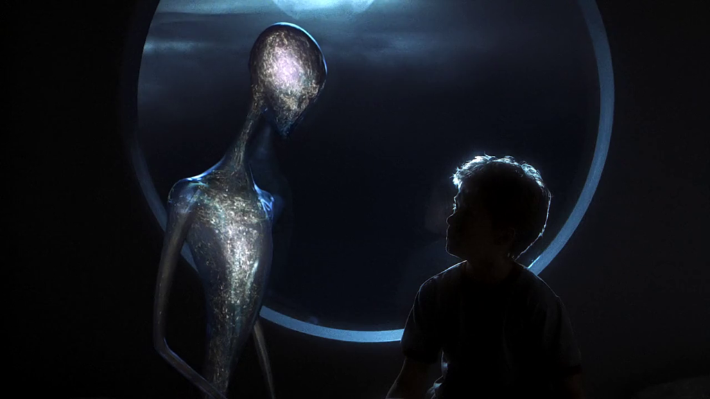 Así, la presentación de David en la casa de su nueva familia (y, por lo tanto, en la historia), sugiere, con toda la intención, la extrañeza de ese ser que llega, su consideración de objeto no verdaderamente humano. Spielberg lo presenta en plano lejano, todavía desenfocado porque está al otro lado de la puerta, y este desenfoque lo representa casi como una de las criaturas alienígenas que poblaban, también en la lejanía, la nave de Encuentros en la tercera fase: una figura ahusada, con el cuello extraordinariamente alargado, todavía nada infantil. No es casualidad que [– spoiler hasta el final del párrafo –], en el sugestivo epílogo del film, los seres que rescatan a David y cumplen, aun efímeramente, su sueño, sean unas criaturas (¿mecánicas?, ¿orgánicas?) cuya forma es como la de esa imagen evanescente y desenfocada de David en su aparición inicial: unos seres de aspecto fusiforme, que parecen tener solo dos dimensiones (largo y alto, sin apenas anchura) y que, desde luego, nada humano parecen aunque se comportarán con el niño-robot como encarnaciones de la verdadera humanidad.