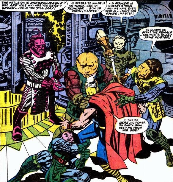 Por fin, Stan Lee bucea en las fuentes de la mitología nórdica, situando las coordenadas básicas de Asgard y sus moradores. Pero eso solo sucede en los primeros relatos. Enseguida, la desbordante inventiva de la pareja utiliza ese material como mero pretexto para un fenomenal despliegue de aventuras que, en rigor, no es sino Espada y Brujería, desarrollando una geografía fantástica, llena de pueblos y criaturas extraordinarias. Lee y Kirby no solo recurren a los clásicos Loki, Balder, Heimdall y demás, sino que incluso crean sus propios personajes. Así, los Relatos suponen la carta de presentación de Los Tres Guerreros, entrañable trasunto asgardiano de los mosqueteros de Dumas (Thor sería D’Artagnan, claro): el jovial espadachín Fandral el Osado, el circunspecto Hogun el Torvo (con su aspecto de guerrero de las estepas asiáticas) y el fanfarrón y trémulo Volstagg el Voluminoso, descacharrante descarga cómica de la serie. (Un ejemplo. En el curso de una batalla, cuando Thor le pregunta si acaso tiene miedo, la respuesta de Volstagg es la siguiente: «¿Miedo? ¿Quién habla de miedo? Pánico tal vez, pero miedo jamás».)
