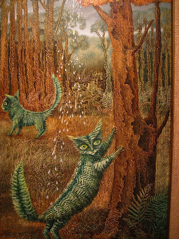 El gato helechoDebo a mi única estancia en tierras mexicanas dos descubrimientos sustanciales: la generosa hospitalidad de sus habitantes y la existencia de una misteriosa pintora llamada Remedios Varo. En el Bosque de Chapultepec, a unos pasos del Museo de Antropología, después de haber consagrado unas cuantas horas a la contemplación de sus vestigios precolombinos, un paseo casual nos llevó a tropezarnos con el cercano y mucho menos conocido Museo de Arte Moderno, situado en un edificio pequeño (por comparación con el muy famoso museo anterior), enclavado en medio de los arbolillos del bosque y flanqueado por atractivas esculturas contemporáneas. Y en sus paredes nos tropezamos con un conjunto de fascinantes lienzos firmados por una pintora española de la que nunca habíamos oído hablar. Una mujer-lechuza que está pintando aves a las que un rayo estelar, filtrado por una lente newtoniana, hace vivir tan pronto concluye el dibujo; una figura solitaria que acciona un extraño engranaje que atrapa el agua de lluvia, mientras se envuelve en una manta ajedrezada que forma parte del suelo; un gato cuyo cuerpo está formado por hojas de helecho y que mira al espectador con sus enormes ojos verdes (ver arriba); una mujer que alimenta con una papilla literalmente estelar nada menos que a una luna en cuarto menguante que está encerrada, cual pajarillo, en una jaula; una ciudad en medio de las aguas cuya forma es una espiral por cuyos canales interiores discurre un conjunto de extrañas embarcaciones… De este maravilloso cuadro, precisamente, está extraída la ilustración que encabeza mi blog: quien quiera verlo en su integridad lo encontrará justo al final del comentario (pero léanlo también, por favor).