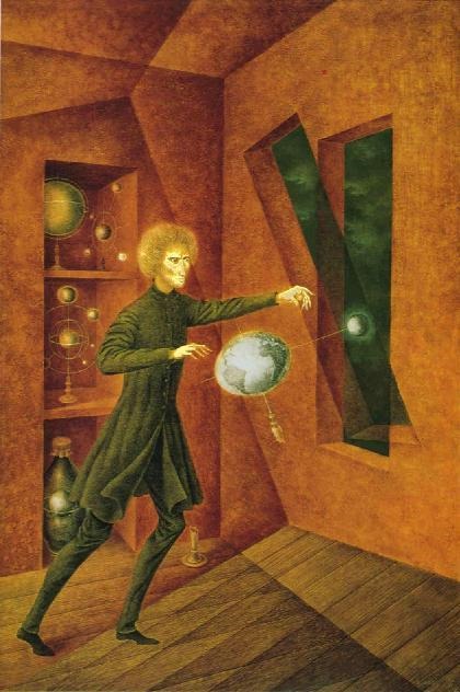 Era hija, no lo olvidemos, de un ingeniero, es decir, de uno de estos profesionales que convierten la ciencia un objeto práctico. De ahí que en sus cuadros siempre trasluzca una sugerente dialéctica entre la ciencia racional o verdadera y la ciencia fabulosa, cuya figura de unión, de transición, la encarna precisamente ese químico de la era pre-científica que es el alquimista. Los mecanismos y engranajes pueblan los lienzos de Varo. Máquinas que nunca funcionan de modo autónomo, sino artesanal, es decir, que necesitan el aliento directo del esfuerzo humano, por quiméricos que sean sus usos (convertir el agua de lluvia o la luz de los astros de la noche en energía, por ejemplo).