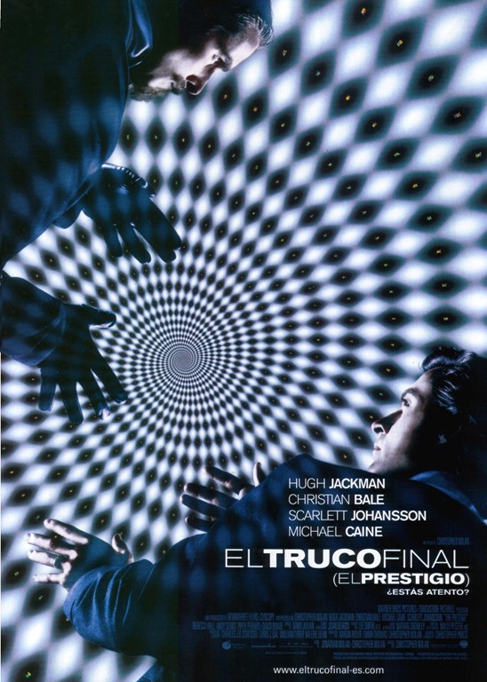 Año: 2006. Dirección: Christopher Nolan. Guión: Christopher y Jonathan Nolan; novela El prestigio, de Christopher Priest. Fotografía: Wally Pfister. Música: David Julyan. Reparto: Hugh Jackman (Angier), Christian Bale (Borden), Scarlett Johansson (Olivia), Michael Caine (Cutter), David Bowie (Tesla). Dur.: 130 min.