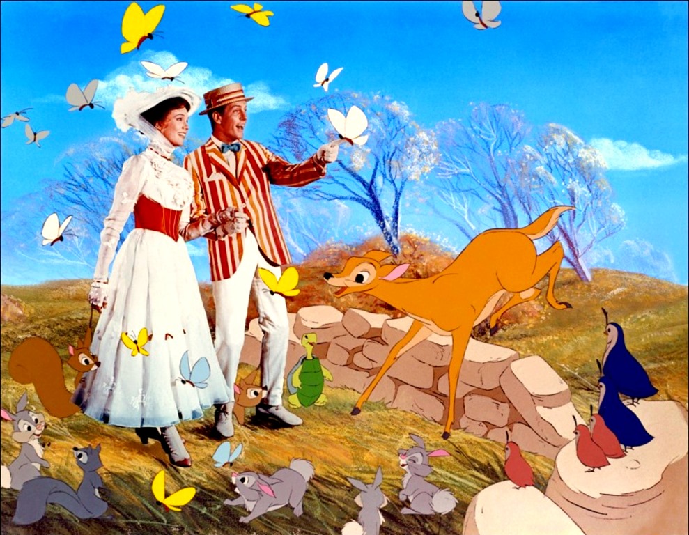 Mary Poppins, eso sí, cuenta con muchos elementos estimables, de ahí que desprenda cierta simpatía. La escena en el mundo de dibujos animados es encantadora (aunque quizá algo larga), y la canción del Supercalifrag…, todo un hallazgo. También estupendo es el número de Chim Chim Cher-ee, que además de ser la mejor canción se desarrolla en unos escenarios de considerable encanto onírico: las figuras de los deshollinadores sobre las chimeneas, recortados como sombras chinescas contra el cielo del Londres crespuscular, componen un plano inolvidable.