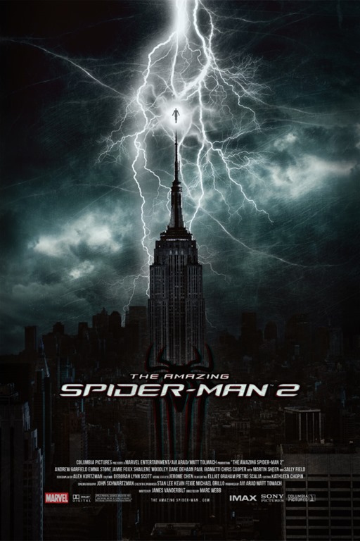 Dirección: Marc Webb. Guión: Alex Kurtzman, Roberto Orci y James Pinkner; historia de James Vanderbilt, Alex Kurtzman, Roberto Orci y James Pinkner. Fotografía: Alex Kurtzman, Roberto Orci y James Pinkner. Música: Hans Zimmer, Johnny Marr y Pharrell Williams. Intérpretes: Andrew Garfield (Spider-Man), Emma Stone (Gwen Stacy), Jamie Foxx (Elektro), Dane DeHaan (Harry Osborn), Sally Field (Tía May). Dur.: 142 min.