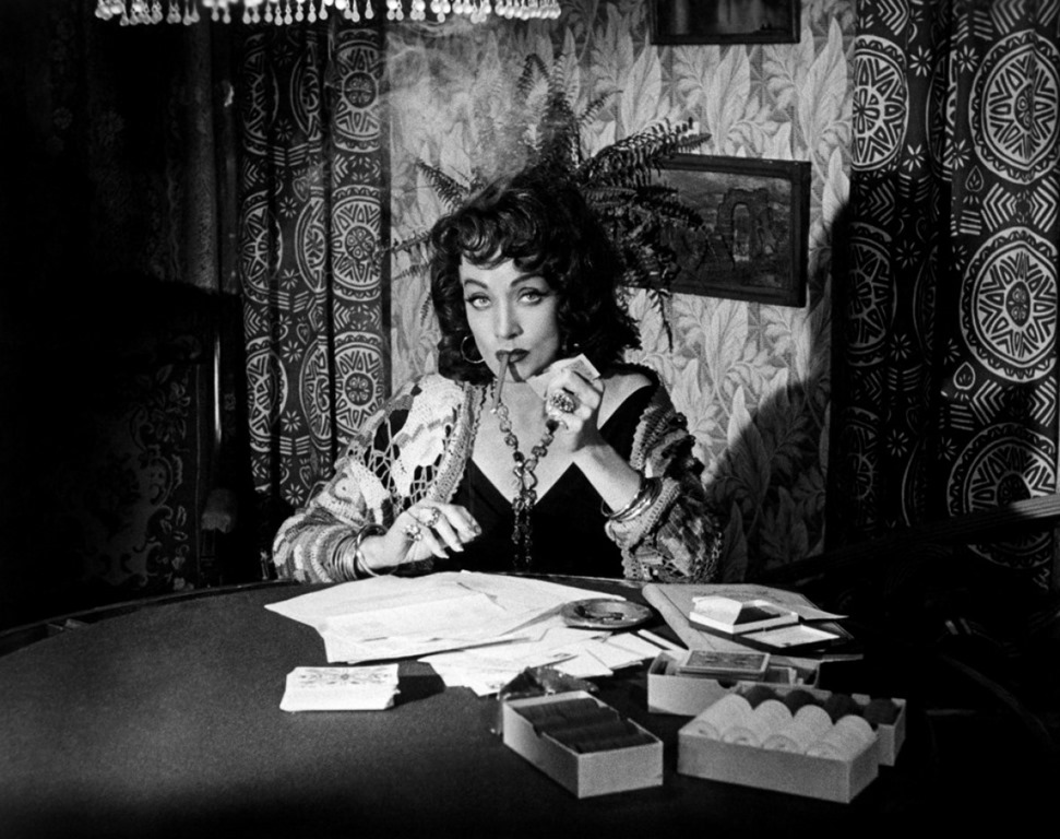 Marlene Dietrich, en el papel más misterioso de su carreraUn héroe arrastrado al barro. Un ogro que termina literalmente en él. Una princesa que casi cae en la completa degradación porque no solo no es muy inteligente sino que se comporta con una insolencia lindante, también, con el racismo: se ha podido casar con un mexicano, pero porque este parece poco mexicano —como señala con lucidez el mismo Quinlan—, mientras que el resto le parecen unos meros «panchos» (de tal modo bautiza, con evidente menosprecio, al joven que le tiende la primera trampa). Un escudero fiel, el sargento Menzies, que termina advirtiendo, cuando ya casi no tiene remedio, la suciedad de la armadura del guerrero al que idolatraba: inolvidable interpretación del veterano secundario Joseph Calleia. Una esfinge con forma de mujer que parece estar en la película para asistir, con imparcial inescrutabilidad, a la tragedia y cerrarla con su presencia: una Marlene Dietrich morena, casi con la apariencia de una adivina gitana, en el papel más extraño de su carrera. Un villano que solo demasiado tarde se da cuenta de que era el bufón: el grotesco Grandi (nuevo exceso: la caracterización del gran Akim Tamiroff, incluido ese peluquín que constantemente se le resbala de la cabeza). Y un escenario a modo de bosque oscuro que es ese pueblo enclavado en la frontera (o lo que es lo mismo: en ninguna parte), a ratos terriblemente ruidoso y abigarrado, en otros siniestramente solitario —esa fantasmal escena en que otro de los jóvenes Grandi acecha a Vargas con un frasco de ácido—, siempre disforme, siempre sórdido. Un lugar de paso al infierno, sin duda.