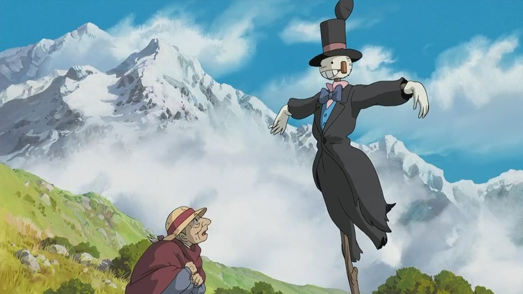 Un plano muy propio de MiyazakiSophie y Howl no son los únicos personajes transformados, o escindidos, de la historia, pues si algo enriquece siempre las películas de Miyazaki es el juego de espejos y la versatilidad dramática. El autor incrementa el papel que tiene en el libro el personaje del espantapájaros que acecha el castillo y lo torna entrañable, de modo prodigioso, pues no es más que un palo cubierto de ropas y con un nabo en el que hay pintados unos ojos y una sonrisa. No importa: Miyazaki consigue animarlo sin necesidad de darle expresión antropomórfica alguna, tan sólo a partir de sus movimientos y acciones en apariencia absurdas pero siempre lógicas, que lo convierten en el más abnegado de los amigos de Sophie.