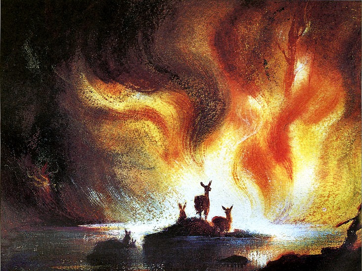 Para quienes todavía consideran que el cine de animación se hace exclusivamente uniendo dibujos, Bambi es, asimismo, una lección de narración cinematográfica, que se desarrolla a través de una puesta en escena de las más sutiles y envolventes de la historia del estudio. Solo dos ejemplos bastan para acreditarlo. Uno, la secuencia del incendio en el bosque bastaría para acreditarlo, con ese tratamiento del fuego como un monstruo de raíz sagrada, invulnerable, ante el que sólo queda el recurso de la huida a sitio seguro desde donde admirar la belleza terrible de su esencia. Y dos, la secuencia más justamente famosa, la muerte de la madre de Bambi, que comienza con un magnífico plano lejano en picado, que crea en el espectador una fuerte inquietud por dos razones (su duración y la abstracción que proporciona ese escenario blanco sin mácula en el que se empequeñecen los dos cuerpos de la madre y el hijo), y que encuentra su hallazgo más feliz en que la cámara sigue la carrera de Bambi, ignorante de que su madre ya ha caído bajo las balas de los cazadores. Recuérdese que el Hombre, el gran enemigo de los animales y de la naturaleza entera, nunca aparece en plano: es una presencia, más fatal que maléfica, que no necesita corporeizarse en pantalla para acechar, siempre en la sombra, la vida del bosque. Bambi, por tanto, es una delicia para los sentidos y una película dirigida a ánimos sensibles, que no sensibleros.