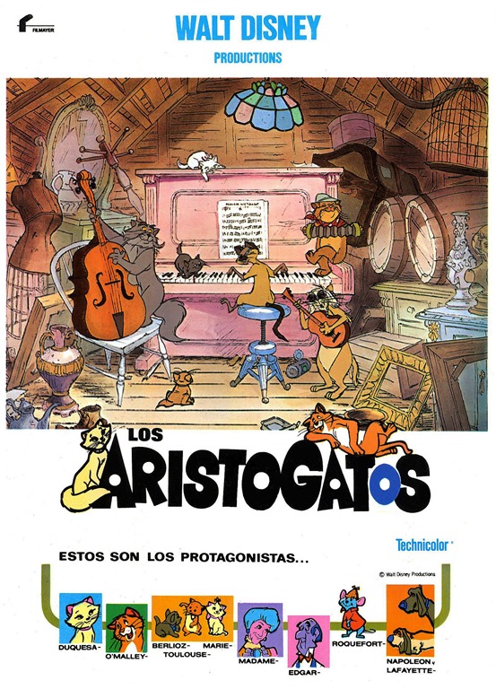 Por último, un recuerdo a ese film posterior a Disney pero impregnado todavía de su aroma. Se trata de Los aristogatos (1970), cuya mejor definición es que diríase que sus creadores, en todo momento, actuaron como si todavía tuvieran que rendir cuentas al creador del estudio. Y es lógico: todavía inseguros por la ausencia de su gran mentor, sus sucesores no quisieron dar un salto en el vacío. Y ello desde la misma historia, que diríase un cruce entre La dama y el vagabundo y 101 dálmatas, trasplantado del mundo de los perros al de los gatos. De la primera película se retoma la idea del encuentro entre una sofisticada gata de alta sociedad con un encantador felino barriobajero que la defenderá de toda clase de peligros, mientras la una aporta al otro glamour y éste encanto pícaro a aquélla. De la segunda, el motor argumental: un villano, en este caso, el mayordomo de una adinerada dama, Edgar, trata de quitar de en medio a sus mimados gatitos, sabedor de que son lo único que se interpone entre la herencia de aquélla y él; conseguido el propósito sólo a medias, se inicia el viaje de regreso a casa por parte de los gatos extraviados.