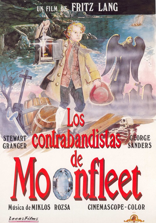 Pasando por encima de Fuego verde (1954), film que hace mucho que no he visto y del que no tengo buen recuerdo, el ciclo aventurero de Granger en la Metro se cierra con una película excepcional, Los contrabandistas de Moonfleet (1955). Excepcional, y poco conocida, pues en su día fue un gran fracaso —en España se estrenó a principios de los 80—, que comenzó desde la misma gestación del proyecto, confiado a un Fritz Lang que no se entendió con el estudio y vio cómo se le reducía el presupuesto y la categoría del proyecto, hasta acabar, casi, en el reducto de la serie B, como delata el muy reducido metraje final. Pero no importa, porque el genial Lang sabe hacer virtud de la necesidad. El obligado recurso a los falsos exteriores, a los telones pintados (para cielos sombríos y siniestras edificaciones) y al rodaje casi exclusivo en decorados le sirve para conseguir una atmósfera de romanticismo que nada tiene que ver con el de Scaramouche y Zenda. Es un romanticismo no de cuento de hadas, como las anteriores películas, sino de raíz germánica, luciferina, que abandona la distensión de los previos títulos en beneficio del fatalismo y de la tragedia, proponiendo a Granger en un personaje que tiene muchos elementos de los anteriores —la obligación del fingimiento (Jeremy Fox lleva una doble vida, como rico hacendado y como contrabandista), el desclasamiento social— pero que los matiza mediante un nuevo aire de pesimismo, de amargura vital, de rabia frente a todos, empezando por sí mismo.