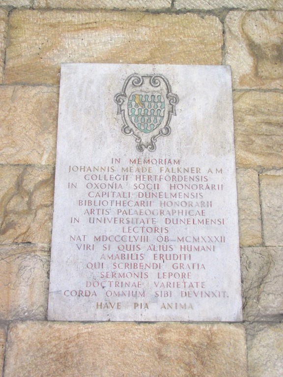Lápida de John Meade FalknerNacido en 1858, en un pueblecito del sureste de Inglaterra, hijo de un párroco, estudió en Oxford y su primer trabajo lo convirtió en tutor de los hijos de un fabricante de armas, Andrew Noble, que lo llevó al lugar donde transcurriría toda su vida profesional, la ciudad industrial de Newcastle, en el noreste del país, muy cerca de la frontera con Escocia. La relación con Noble fue mayor de ese trabajo inicial: se convirtió en amistad y en confianza, hasta tal punto que Falkner acabó convirtiéndose en el director de la empresa. El estallido de la Primera Guerra Mundial hizo de Falkner un hombre muy bien relacionado dentro del gran mundo de la política y la diplomacia, para el que además parece que poseía notables cualidades personales. En fin, la intensa dedicación a la que le obligaba este trabajo explica su obra literaria tan escasa. Sin embargo, Falkner tuvo tiempo aún para alimentar ese amor por la erudición medieval, por la investigación histórica, por los viejos manuscritos, que dio pie a esa obra ensayística a la que se consagró, sobre todo, cuando se jubiló por fin en 1926. Marchó a vivir a la bella ciudad de Durham, no lejos de Newcastle, cuyo centro urbano sigue pareciendo un relicario medieval, coronado por esa famosa catedral que, sobre un alto cerro, fue definida por Walter Scott como «mitad templo para Dios, mitad castillo contra los escoceses». Precisamente fue nombrado bibliotecario honorario de esa catedral y contribuyó notablemente a gestión. Así lo recuerda una placa que se encuentra en su claustro y que, en mi reciente viaje a Escocia, me recordó su figura, modesta pero eminente, y me incitó a recuperar la novela que había leído muchos años atrás.