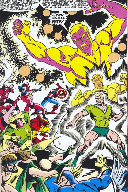 Y llegó un día en que los héroes más poderosos de la Tierra, los Vengadores, encontraron por fin a un enemigo mucho más poderoso aún. Así lo llamaron ellos, El Enemigo, aunque él se daba a sí mismo el nombre de Michael, y antes aún había sido Korvac, el Hombre Máquina, un villano procedente del siglo XXXI. Y ese día hallaron la muerte, a sus manos, el Hombre de Hierro, el Capitán América, la Bruja Escarlata, la Visión, los Guardianes de la Galaxia y tantos héroes como estrellas tenía el cielo… A grandes rasgos, esta es la conclusión de una de las más célebres sagas del Universo Marvel, la llamada Saga de Korvac, que se desarrolló en la serie The Avengers entre los números 167 a 177, de enero a noviembre de 1978, concebida por el guionista Jim Shooter y concluida con la colaboración de múltiples artistas. Si todavía hoy se la recuerda es porque, como indico en esta entradilla, se rompió (al menos en apariencia) un principio sagrado del tebeo de superhéroes: por mal que le pongan las cosas los villanos, los héroes siempre salen triunfantes e íntegros de los combates. Pero en aquel mítico nº 177, y ante la sorpresa del lector adolescente que uno fue, todos esos grandes héroes, hasta entonces invencibles, empezaron a caer uno a uno ante el poder desatado de un hombre que proclama ser un dios y que, cierto, llevaba varios números dando muestras de serlo.