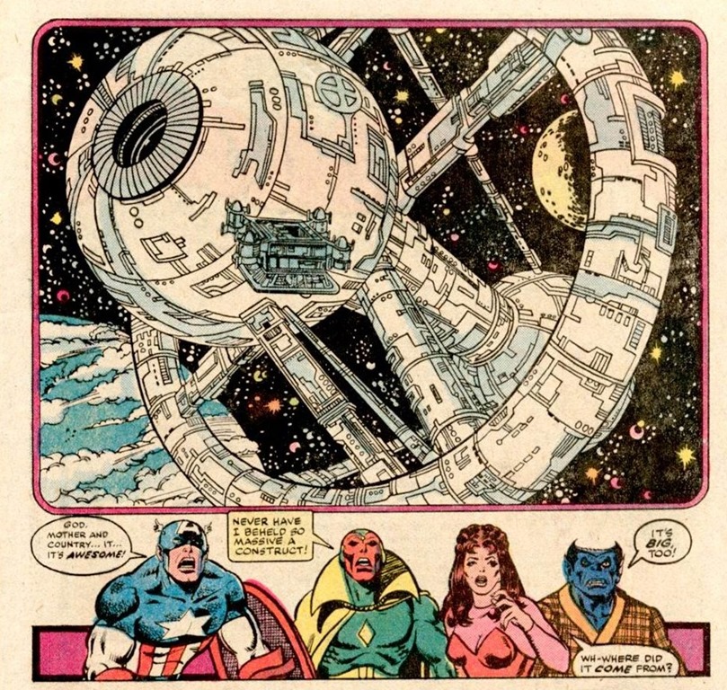 La primera es otorgar el «respiro» adecuado al desarrollo de la aventura, es decir, concederle el espacio suficiente para hacerla madurar sin precipitación, dejando que el lector fuera conociendo poco a poco los detalles de su curso y del villano al que van a enfrentarse los Vengadores. Hablamos de una época en que estas sagas de gran duración no eran habituales: poco después, Chris Claremont las convertiría en el gran reclamo de su exitosa etapa al frente de La Patrulla-X, pero acabó abusando hasta la extenuación de ellas. Shooter le dedicó diez números, pero, nuevo acierto, no los consagró en exclusiva al enfrentamiento con El Enemigo, sino que fue dosificando sus apariciones y embarcando, entretanto, a los Vengadores, en otros combates. Con fortuna, el más emocionante de estos —los Vengadores, o sea, todos cuantos son o han sido alguna vez Vengadores, van desapareciendo uno a uno de la Tierra, y el culpable resulta ser un antiguo villano de la serie, el misterioso primigenio cósmico conocido como el Coleccionista— es un eslabón que conduce al Enemigo. Pues si el Coleccionista está secuestrando a los héroes es para preservarlos, en animación suspendida en su sancta sanctorum espacial, de esa amenaza que él sabe mortal para ellos. De hecho, la mujer a la que el Enemigo ha buscado como compañera y amante, la mencionada Carina, es la hija del Coleccionista, enviada por éste para averiguar todo lo posible sobre él. En una escena realmente impactante, desde su casa de Forest Hills, Michael destruye (literalmente) al Coleccionista en su nave en órbita sobre la Tierra, justo cuando éste iba a referir su identidad a los espantados Vengadores.