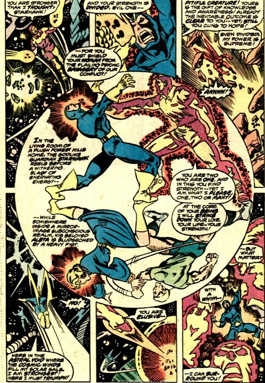Es una idea ciertamente espléndida, tanto por la densidad dramática con que reevalúa el concepto clásico de «supervillano» como por las posibilidades argumentales a que se presta. De hecho, la entidad de Michael a lo largo de toda la saga es tal que cada vez que aparece el interés se incrementa con mucho. Por ejemplo, es inolvidable el duelo entre Michael y el más perceptivo (y misterioso) de los héroes que lo buscan, el miembro de los Guardianes de la Galaxia llamado Halcón Estelar, en cuyo curso el mismo tejido de la realidad es sutilmente alterado y el Guardián es convertido en polvo y luego rehecho literalmente (en el acto indudablemente más divino de Michael) pero con sus sentidos alterados para no poder volver a percibirlo nunca más. Sin lugar a dudas, George Perez obtuvo con esta batalla, narrada en las páginas finales del nº 168 el momento culminante de toda su carrera, capaz de traducir al dibujo la escala verdaderamente cósmica del enfrentamiento. Es triste que ya no dibujara una sola página más de la saga. Por último, hay que indicar que, finalmente, la perdición de Michael llegará como consecuencia de su batalla contra Halcón Estelar: los Vengadores acabarán llegando a su casa pues los escasos indicios que poseen del Enemigo los conducen hasta allí, pero están a punto de abandonarla, ante el infructuoso resultado del registro, cuando Halcón Estelar, presente allí, acaba estallando en furia al creer que sus compañeros se están riendo de él. Pues donde todos parecen estar dirigiéndose a alguien… él no ve a nadie. Lo cual indica un ser de enorme poder que es capaz de ocultarse ante los sentidos del más penetrante de ellos.