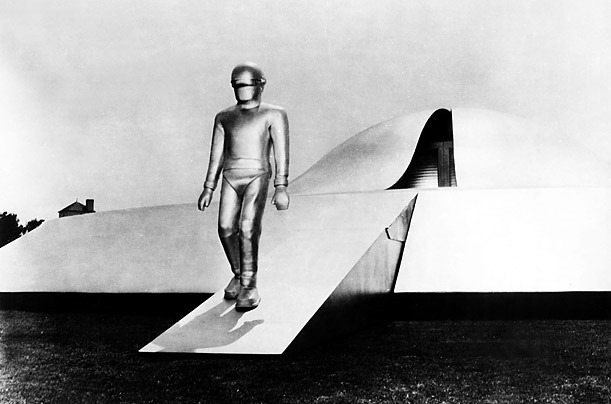 El guionista Edmund H. North optó por la considerable novedad de convertir al primero en el protagonista absoluto de la historia, que de hecho comienza con la llegada a la Tierra de su nave espacial. El inicio de Ultimátum a la tierra (1951) es espléndido. Bajo los títulos de créditos van apareciendo una serie de imágenes del espacio, desde la primera, nuestra entrañable Vía Láctea, hasta la última, que muestra un plano de la Tierra vista desde la Luna: todo ello para dar pie a la idea de algo que se aproxima a nuestro planeta. Para crear este efecto de viaje espacial resulta imprescindible la música compuesta por Bernard Herrmann para la ocasión: la combinación de instrumentos (sobre todo el arpa y el sigular teremín) crea una sensación de extrañeza que sin duda es memorable. A ello contribuye que el objeto que cruza los cielos de la Tierra no se muestra directamente (pero sí las reacciones que despierta en todos los países que atraviesa) hasta que aterriza en el corazón de Washington. Su diseño se revela estupendo: un artefacto con la forma canónica del platillo volante de aquella época, de superficie absolutamente lisa, que de pronto se abre allí donde no se sospechaba una sola fisura para dejar avanzar, con suave elegancia, una plataforma de desembarco. Ese gusto por las formas lisas se mantiene con la aparición del robot Gort, cuya frontalidad —como si se hubiera materializado de una pintura de las antiguas civilizaciones fluviales— resulta del todo majestuosa. Será naif, pero es inolvidable.