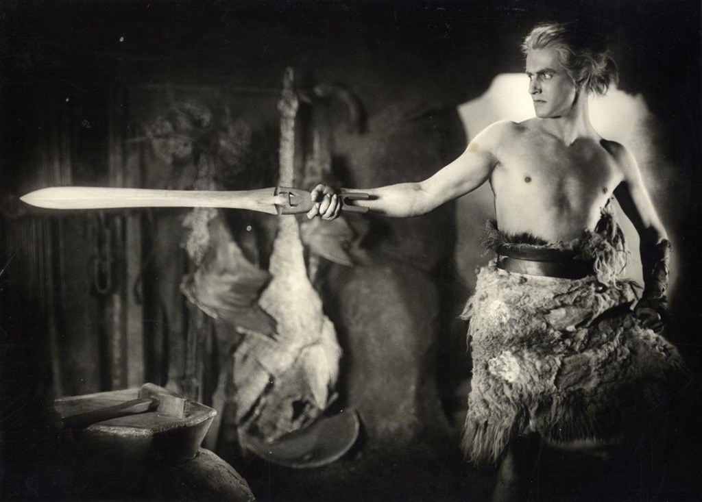 Así, la película empieza directamente con Sigfrido forjando su espada en la cueva de Mime, personaje que aquí no parece poseer ninguna relación con Alberico. Por cierto, que es fenomenal ese plano —que sigue una idea de la Saga de los Volsungos— en que, para comprobar la calidad de la hoja, Mime lanza una pluma al aire y aquélla la hiende limpiamente en dos trozos. Dicho esto, el gran herrero afirma que ya no puede enseñar a Sigfrido (lo cual indica que la relación entre ambos ha sido de maestro y discípulo, por tanto como la de Sigurd y Regin en los Volsungos) y le dice que ya puede volver a Xanten, con su padre el rey Sigmund. Lang y Harbou, por tanto, mezclan sin prejuicios la saga islandesa y el cantar con Wagner (Mime es invención suya, recuérdese).