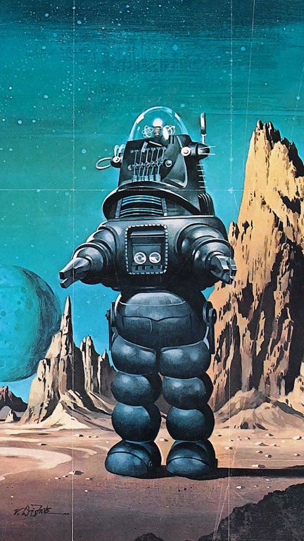 Siguiendo con el equivalente entre Shakespeare y el film que nos ocupaba, a este último corresponde el papel de sirviente mágico —aunque aquí la magia se llama «ciencia»— que en la obra representa Ariel. Si los guionistas del film realmente se inspiraron en La tempestad, es bien divertido el contraste El inolvidable Robbyentre esos dos sirvientes. Ariel es un genio del aire, etéreo y grácil —las diversas representaciones gráficas que de él se han hecho, desde el tiempo de los prerrafaelitas, la muestran como una niña-mujer al estilo de la Campanilla de Disney—, mientras que Robby es un armatoste amorfo, pesado y nada elegante, que diríase imposible que puede moverse. Este trasto, sin embargo, y como indicaba en el artículo justo anterior dedicado a los robots de cine, supone uno de los más sugestivos iconos de la ciencia-ficción clásica. No es cuestión de repetirme, pero la gracia de su diseño estriba, ante todo, en la insólita expresividad que se otorga a ese cabezón que casi parece una máquina tragaperras que deja ver su interior gracias a la especie de campana de plástico que lo recubre. Y cuya apariencia amenazadora contrasta con su incapacidad para hacer el menor daño a un humano, ni ordenándoselo Morbius: aunque no lo dicen, está claro que sus circuitos deben tener registradas las famosas tres leyes de la robótica de Asimov.