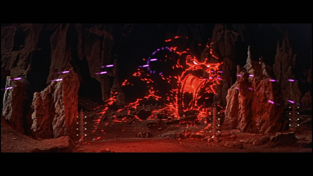 En fin, si La tempestad gira en torno a las pruebas a que Próspero somete a los náufragos con el objeto de redimir, perdonar o castigar y regresar a su tierra natal, en Planeta prohibido es todo lo contrario: Morbius se resiste a volver a la Tierra, pues en Altair-IV tiene el estímulo intelectual que precisa y todavía apenas ha esbozado el trabajo de su vida, que es sacar a la luz los prodigiosos avances de los Krell. En cambio, los viajeros estelares se verán puestos a prueba por esa fuerza destructiva que veinte años atrás ya se cobró tantas víctimas, y que surge cuando el comandante Adams deja bien claro que pretende volver con Morbius padre e hija. Al principio, la fuerza (invisible) se expresa mediante unas pisadas monstruosas en el suelo que rodea a la nave y un sabotaje en su interior. Pero después se producen verdaderos ataques, en cuyo curso los expedicionarios descubren que la forma real de esa fuerza es la de un monstruo gigantesco y de expresión furiosa —de diseño muy similar, es curioso, al Demonio de Tasmania de los dibujos animados de la Warner.