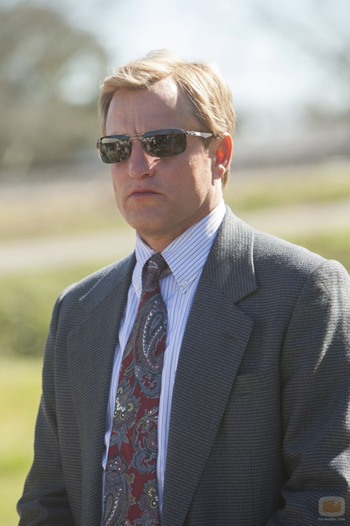 Más asequible, pero también más difícil, era el papel de Woody Harrelson. De entrada, Harrelson es un actor por el que siempre he sentido un particular rechazo, labrado en su predilección por interpretar tipos insoportables que, en sus manos, resultaban ya directamente odiosos (su intervención, por ejemplo, en Asesinos natos, del inefable Oliver Stone, es de lo peor que yo he visto en cine). A simple vista, Harrelson mantiene a su Marty dentro de lo que se espera de él, y por momentos parece que su registro interpretativo es el de siempre: proyectar hacia fuera el mentón en los momentos tanto de tensión como de distensión. Sin embargo, en la revisión, su interpretación gana matices, en buena parte también por el excelente trabajo de caracterización —esa progresiva alopecia (que se corresponde con la realidad) que en su caso lo humaniza—, y que en el tramo final de la serie su personaje despierte una inesperada simpatía, incluso ternura, o bien revela un trabajo dramático extraordinario sobre el personaje… o una buena interpretación del actor.