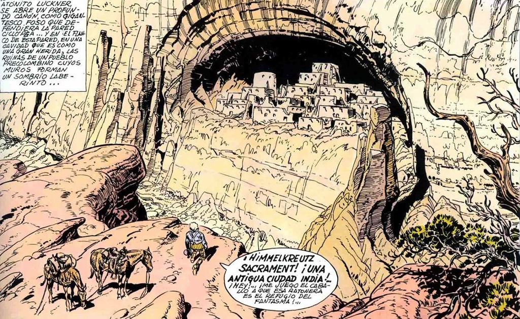 La ciudad del fantasma de las balas de oroLa parte final se desarrolla en otro espacio fascinante: una antigua ciudad indígena enclavada en una oquedad natural situada en medio de la pared rocosa, como las que existen en el Parque Nacional Mesa Verde, en Colorado, construido por los indios pueblos, civilización amerindia que desapareció varios siglos antes de la llegada de los europeos al territorio que luego sería Estados Unidos. (Este escenario final, y el hecho de que la trama vincule a distintos indeseables en torno a la búsqueda del oro, ha llevado a algunos a alegar que Giraud se inspiró en una película estrenada poco antes, El oro de McKenna, de 1969, si bien en poco más coinciden.) Allí es donde se revelará la sórdida verdad: el fantasma (cuyo objetivo hace ya muchas páginas que es evidente: el mismo Prosit y nadie más) no es sino el verdadero Werner Amadeus von Luckner, el auténtico aristócrata prusiano de quien el falso no era sino su criado.