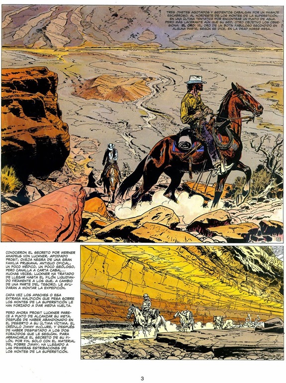 La estupenda página inicial de El fantasma de las balas de oroEl fantasma de las balas de oro comienza de modo estupendo, con los cuatro personajes dirigiéndose hacia el solitario paraje donde debe hallarse la mina, de tal modo que los villanos ya tienen ocasión de mostrar todo su repertorio de trapacerías: Prosit intenta, de entrada, aplastar a los otros tres mediante una avalancha cuando se habían arrojado sobre el último pozo de agua del territorio; Wally, después, cuando los apaches hacen acto de presencia, dispara contra el caballo de Blueberry para dejarlo a merced de los indios y aprovecha para escapar con Prosit, ya puesto a su merced. Los cuatro huyen al único refugio posible: la Mesa.