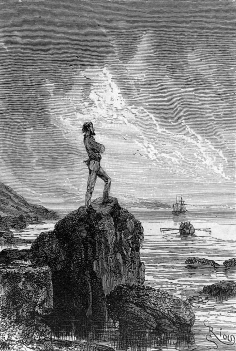 La despedida de Ayrton en la isla de TaborHablaba líneas atrás de la grandeza, aun sórdida, que envuelve al personaje de Ayrton. Si los expedicionarios encuentran al capitán es porque el traidor llega al acuerdo con lord Glenarvan de que, a cambio de contarle su historia, no lo entregue a la justicia de los hombres (que le reserva, sin duda, la pena capital por sus fechorías en Australia) sino a la expiación de sus crímenes en una isla solitaria, que será Tabor. Allí, Glenarvan lo deja abandonado, pero no olvidado, como le dice —en lo que para mí supone uno los momentos más emotivos de toda la novela, que resume a la perfección la entraña humanista de toda la obra verniana, pues esas palabras del lord vienen a reconocer a todo hombre, incluso al más desalmado, la oportunidad de la redención. Verne despide a Ayrton haciendo que lo último que vean de él los pasajeros del Duncan sea su imagen con los brazos cruzados, contemplando con aparente indiferencia los elementos, sin dejar traslucir la zozobra del abandono en una pequeñísima isla desierta. Imagen que Verne siempre reserva para los personajes más nobles e indomables de su obra: para el capitán Hatteras, para el capitán Nemo, para Miguel Strogoff. Michel Verne, su hijo, que manipuló los manuscritos inéditos de su padre para exprimir su nombre de modo póstumo, le rindió el mejor de los homenajes en el final de Los náufragos del Jonathan (novela que le pertenece casi por completo, y cuyas modificaciones la hacen estupenda, a todo esto), al hacer que su héroe, el Kaw-djer, el anarquista desengañado del fracaso de las utopías, asuma su refugio final en el faro del cabo de Hornos (en el fin del mundo, pues), enarbolando idéntica y orgullosa postura en el imborrable párrafo final de esta novela.