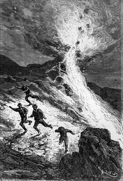 Paganel provoca la erupción de un volcán para escapar de los maoríesLa aventura concluye, además, con una sucesión de clímax a cuál más emocionante. Primero, la fuga en el último momento de la prisión maorí, apenas a unas horas de su ejecución por parte de sus captores. Segundo, la erupción que provoca Paganel en la montaña volcánica cuyo tabú les concede un momento de respiro en la persecución de los salvajes. (No se olvide la admiración que sintió Verne por los volcanes, la máxima expresión del poder de la naturaleza para el autor: un volcán supone el exacto polo norte en Las aventuras del capitán Hatteras; un volcán, apagado, sirve para entrar en el centro de la Tierra (y otro, esta vez encendido, para salir de ella); un volcán preside La isla misteriosa y al final será responsable de su destrucción; un volcán, en fin, permite la supervivencia de los viajeros estelares en el cometa de Hector Servadac, la más fantástica de las novelas vernianas.) Tercero, el rescate en el proverbial último segundo por parte del Duncan, que da pie a un momento de intenso dramatismo, pues realmente no creen sino que es el yate en manos de Ayrton y sus sicarios, sin saber todavía que Paganel salvó al buque (y a ellos) al enviarlo, por error, a la costa de Nueva Zelanda y no de Australia, librándolo así de la trampa del traidor, el cual, debido a su furiosa reacción ante su inesperado contenido, está encerrado en la bodega.