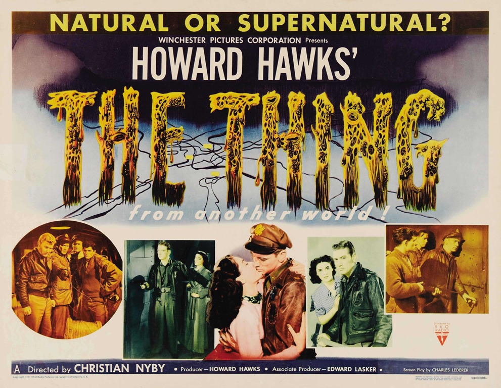 El relato fue adaptado por primera vez en 1951, justo en el alborear de la primera gran edad de oro del cine de ciencia-ficción en Hollywood, bajo un título diferente y supuestamente más impactante, ligeramente alterado en España: El enigma… de otro mundo. Se trata de una película por la que, en general, se siente gran cariño; incluso gozó de mucho prestigio entre los cinéfilos, y eso fue motivo para que se denigrase La cosa (que más que un remake, como se verá, es una adaptación más fiel del relato de Campbell) en el momento de su estreno, circunstancia ésta que ha acabado remitiendo en los últimos tiempos. En cualquier caso, y las cosas como son, esta fama —que ha permitido que a ella se acercaran espectadores que normalmente no frecuentan la ciencia-ficción de serie B— se debe a la implicación del gran cineasta Howard Hawks en el proyecto. Hawks figura como su productor, mientras que la realización la firma, en su debut en esta especialidad, Christian Nyby, montador de varios de sus films de la década anterior y que a partir de aquí inició una carrera como director que fue prolífica (en televisión) pero de la que no queda el menor recuerdo. De hecho, todavía colea la polémica acerca de la verdadera autoría de la dirección: incluso actores del mismo reparto afirman unos que fue Nyby en verdad y otros que fue Hawks el responsable. Particularmente, aunque no tengo espacio para extenderme, creo que lo normal es que Nyby dirigiera el film, pero que inevitablemente Hawks influyera todo lo que pudo en su labor e incluso que se hiciera responsable de alguna escena.