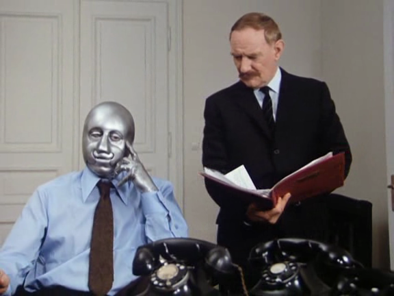 Aun lastrada por evidentes defectos —la pobreza de sus medios: la caracterización «acerada» de Martino es más bien risible, como se puede ver en las fotografías que incluyo; una realización muy pobre, que da a la película la apariencia de un telefilm; cierta falta de vigor en el relato—, La máscara de acero es una película muy estimable, cuyo aroma de desengañada tristeza (bien expresada, aunque no sé si de modo involuntario, por el feísmo visual de sus imágenes) provoca una evidente adhesión emocional en el espectador, quien acaba sintiendo una notable compasión por esa figura zarandeada que, embutida en su apariencia plateada (nunca veremos el rostro del actor Edward Bova), no solo siente una completa incertidumbre ante lo que va a ser de él, sino que, obligado a evocar su vida pasada desde el presente por los dos interrogadores, advierte que fue entonces cuando puso la semilla de la deshumanización posterior: que quizá ahora, cuando menos hombre parece, es cuando por fin está alcanzando el estadio de la humanidad. [–spoiler hasta el final del párrafo–] Y es que Martino descubrirá la triste verdad de que el dolor nos hace humanos. En el inolvidable final de la película, cuando el agente Rogers acude a verlo en su retiro en la granja donde se crió, en la cual lleva varios meses dedicado únicamente al cultivo de la tierra, para decirle que por fin han llegado a la conclusión de que es quien dice ser y le permiten volver a su puesto, éste se niega a hacerlo. Al preguntarle el desconcertado Rogers qué debe decirles a sus superiores, aquél contesta: «Dígales que nunca más seré Lucas Martino».