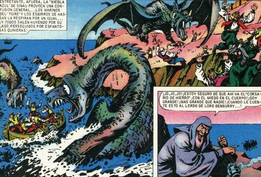 En fin, a lo largo de sus once años de trayectoria (cerrada, por tanto, en 1981), El Corsario de Hierro tuvo tiempo de proponer un número extraordinario de imborrables peripecias, unidas en el recuerdo por un denominador común: el buen humor con que sus personajes afrontan todas y cada una de sus empresas (¿cuántos episodios acaban con una viñeta que los muestra riendo abiertamente de alguna ocurrencia?). Su recuperación demuestra que son algo más que un producto de la nostalgia infantil… Pero no puedo evitar añorar aquellos días en que marchaba al kiosco para comprar, desordenadas (y eso era parte de su atractivo), cualquiera de sus aventuras: si una semana me hallaba rumbo al Nuevo Mundo, a la siguiente estaba en Venecia (creo que fue aquí cuando me enamoré de esta ciudad) y luego en el corazón de la jungla africana. Y recuerdo cuánto me emocionaba unirme a una cualquiera de las lides (por supuesto, contra un enemigo muy superior en número) que emprendía el Corsario, la sonrisa en la boca y el temple en la espada, mientras Merlini trataba, en vano, de hacer brotar serpientes de la manga de algún sicario y el enorme escocés se arrojaba sin precaución alguna al corazón del combate mientras gritaba «¡Por todos los Mac Meck!».