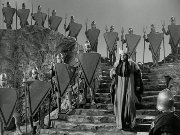 La ausencia de decorados —el castillo es ante todo un espacio vacío con una gran escalinata tallada en la piedra, un arco que representa la puerta y unos monolitos que se supone constituyen la muralla de la fortaleza de Dunsinane— y de exteriores hizo que Welles utilizara a raudales la niebla para disimular la nada, pero también para crear una formidable atmósfera de incertidumbre (en más de un momento los personajes son incapaces de ver lo que sucede a su alrededor, en sentido simbólico pero también literal). Este recurso, tan propio del cine barato, claro, no lo inventó él y muchos otros lo usarían en el futuro (pienso en Roger Corman y sus adaptaciones de los relatos de terror de Poe), pero Welles, satisfecho del uso estético y dramático que le da, lo convierte en ostentoso sello de estilo, volviendo a cansar por acumulación.