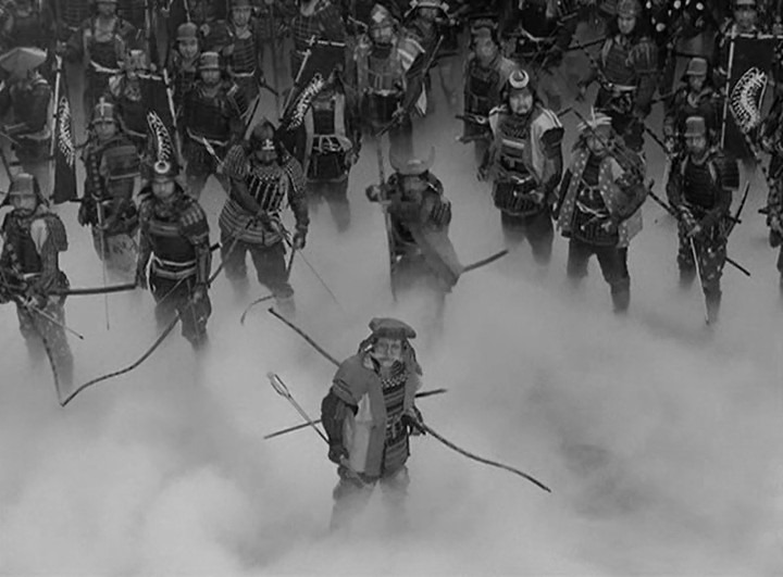 Ahora bien, el uso que hace Kurosawa de la niebla nada tiene que ver con el perseguido por Orson Welles en su previa adaptación de la misma obra (por otra parte, parece ser que el director nipón no estimaba en mucho las versiones shakesperianas del director de Ciudadano Kane). En Trono de sangre el papel que posee la niebla es como expresión de lo sobrenatural. Así, justo después del encuentro inicial de Washizu y su amigo el general Miki (Banquo) con el espíritu del bosque, los dos hombres —tan sobrecogidos por la experiencia que no pronuncian entre ellos una sola palabra— cabalgan y cabalgan sin poder deshacerse de esa húmeda mortaja hasta que, de pronto, consiguen ver los muros del castillo al que se dirigen: se crea así la poderosa sensación de que los dos guerreros han pasado una estancia en el más allá, de donde salen evidentemente transformados para siempre. La misma niebla reaparece cuando el protagonista observa, alucinado, que está sucediendo lo que nunca creyó que sucedería: que el bosque se encamine al castillo, anuncio de su perdición (la concepción visual de este momento, al menos, sí delata un atento visionado de la película de Welles por parte de Kurosawa). Por último, la niebla invade el patio de su fortaleza justo cuando sus hombres deciden acabar con su vida, como si fueran meros ejecutores de un destino demoniaco que los ha manejado a todos como muñecos.