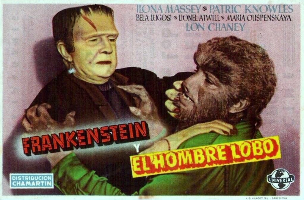 Frankenstein y el hombre lobo, el origen del spanish horrorVolviendo a la Universal, hay que insistir en que la inspiración de Naschy (a nivel argumental, me refiero) fue en esos títulos que el estudio realizó cuando ya entraba en irreversible decadencia y su terror gótico se degradaba, adquiriendo un aire tebeístico sin duda más dirigido a audiencias juveniles (incluso infantiles) que adultas. Y es que la productora, tratando de revitalizar como fuera a sus criaturas, las unió en una serie de películas que hoy reciben el entrañable remoquete de cócteles de monstruos. Como él relataba, fue el primero de ellos, Frankenstein y el hombre lobo (1943), el que marcó su fascinación por el personaje. Tanto este como los otros títulos del ciclo parten de bases argumentales toscas y apenas trabajadas, con actores en decadencia o de tercera categoría y presupuestos muy ajustados. Pero eso sí, que por lo menos salvan la honra y permiten todavía la revisión sin rubores debido a su enorme encanto plástico: el cine de terror se salva o se pierde a través de la atmósfera y la sugestión visual antes que por los guiones. El horror español no tuvo ni siquiera este consuelo.