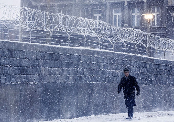 Y hablo en plural porque (es lo más interesante de toda esta parte), Donovan asiste atónito a las rivalidades entre la potencia soviética y ese estado satélite que intenta preservar al menos la apariencia de autonomía, oponiendo obstáculos al deseo del abogado de unir las suertes de los dos muchachos encarcelados a cambio de la entrega de Abel. Ante el escaso interés de los hombres de la CIA que supervisan las andanzas del abogado por la ciudad (a ellos solo les interesa el soldado), Donovan deja claro que, para él, cualquier vida es importante. (Este noble leit-motiv enlaza con el famoso, y al menos para mí emocionante, eslogan con que se publicitó La lista de Schindler en su estreno en 1993: quien salva una vida, salva al mundo.)