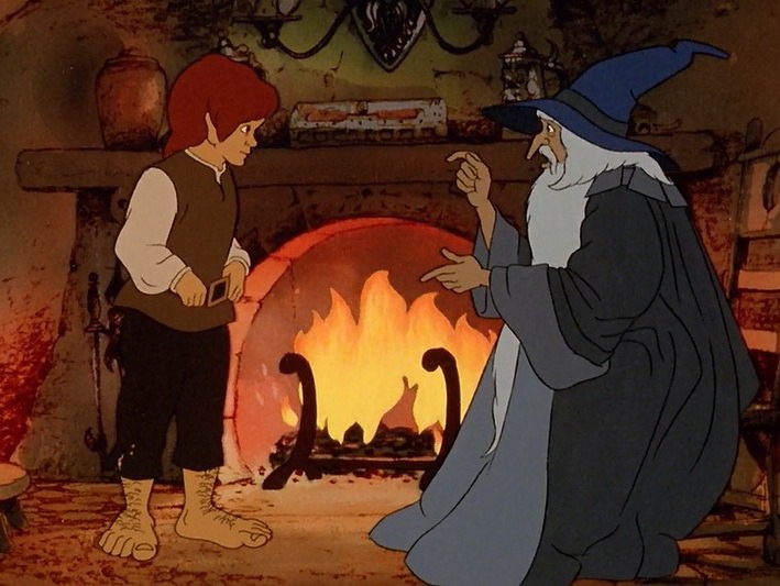 Y es que aunque la película no consigue, por supuesto, revestirse de la majestuosa densidad que poseen esas páginas del libro, sus imágenes sí saben recrear el ambiente necesario para entrar en la aventura: un buen prólogo construido ya con actores de carne y hueso a modo de sombras chinescas (Peter Jackson lo tuvo muy en cuenta para su película) que resume los lejanos acontecimientos que dan lugar a la Guerra del Anillo; un muy agradable dibujo de la Comarca, que reproduce su condición de lugar apacible y provinciano, de cuyos sencillos habitantes nadie sospecharía la relevancia que alcanzarán en los inminentes acontecimientos; y una excelente reproducción de la gran cualidad de esas páginas iniciales, esto es, el peso, al tiempo nostálgico y opresivo, que alcanza el pasado sobre los personajes, primero Bilbo, y después Frodo, siempre con Gandalf como desencadenante de presagios y calamidades. Esos minutos iniciales, por tanto, no sólo consiguen que el espectador se haga una idea razonable de la situación de partida sino que lo animan a unirse a los hobbits para recorrer la larguísima distancia entre Hobbiton, en la Comarca, y la Montaña del Destino, en Mordor.