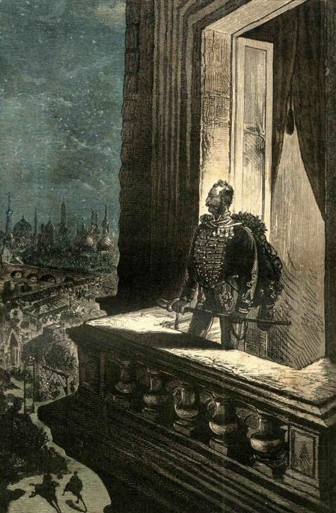 El oficial con uniforme de cazadores, esto es, el zarLa otra es, por supuesto, Miguel Strogoff. Los diálogos informan a un personaje tratado con gran respeto del progresivo corte de comunicaciones con varias ciudades de Siberia, poniendo inmediatamente en la situación de partida: la invasión de esa vasta región. Verne se va a referir a ese hombre por su atuendo de oficial de cazadores de la guardia. La gracia de la situación es que no se llega a decir, hasta el final del capítulo, que ese oficial es el zar y que el palacio donde éste recibe tan cruciales informaciones que lo mantienen en tensión está en el Kremlin de Moscú. No se dice, pero, claro, se sabe, creándose un grácil juego de sobreentendidos entre autor y lectores que otorgan su peculiar sabor al capítulo, por cuanto además Verne describe con gran soltura el ambiente (al mismo tiempo que está al tanto de los nuevos despachos, el zar es el anfitrión de un gran baile de la corte), el contraste entre el lógico bullicio y la terrible tensión que ese hombre debe disimular y la descripción de un par de personajes que van a ser fundamentales en la trama y sobre los que ahora hablaré. En las últimas líneas del capítulo, en un párrafo que solo puedo calificar de memorable —y que debe complementarse con la recreación de la ilustración de Férat (v. supra) donde se observa al zar asomado a un balcón del palacio, con el fondo de cúpulas bulbosas y el río que identifica a su capital— se confirman todos los datos antedichos: «Aquel río era el Moskova; la ciudad, Moscú; el recinto fortificado, el Kremlin, y el oficial de cazadores de la guardia que, con los brazos cruzados y la frente pensativa, escuchaba vagamente el rumor que el Palacio Nuevo vertía sobre la ciudadela moscovita era el zar». No cabe duda: también existe la poesía en las frases breves y concisas.