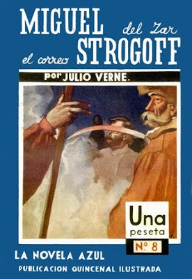 Miguel Strogoff en La Novela Azul, de JuventudPero la fortuna de la novela, huelga decirlo, arranca de la adhesión sin límite que provoca su protagonista, Miguel Strogoff, el correo del zar. Se suele a acusar a Verne de que sus personajes son unidimensionales y de que no tienen un espesor psicológico digno de ese nombre. Pero… al diablo. ¿Puede haber un retrato más emotivo, más soberbio, más irresistible, de una naturaleza humana indomable, inasequible al desaliento, nunca una mera máquina inhumana sino por el contrario un hombre pleno de sentimientos —rabia, odio, impotencia, amor— que ha de sujetar a la ejecución de la empresa que ha jurado cumplir… como el de Miguel Strogoff? A su vera, cobra un inusitado relieve el dibujo de paisajes y gentes que viven a medida que el correo los atraviesa o se relaciona con ellos, ofreciendo un fresco imborrable pródigo en magníficos episodios: el cruce nocturno de los Urales agitados por la tempestad; el primer encuentro entre Ogareff y el correo (cada uno ignorante de quién es el otro), en el que el segundo tiene que dejar pasar sin vengar un ultraje físico por parte del primero; el paso del río Irtish, cuando su balsa es asaltada por los tártaros y Miguel Strogoff cae malherido a las aguas del río; la toma del puesto telegráfico de Kolyvan, cuando el protagonista cae prisionero; el emotivo momento en que él y su compañera encuentran a punto de morir al noble muchacho que los llevó en su carro un buen trecho del camino, sometido al suplicio tártaro de enterrar todo su cuerpo y dejar la cabeza expuesta a los elementos y las fieras; la navegación por el río Angara para alcanzar la sitiada Irkutsk, en una frágil almadía, sometidos al doble peligro de los témpanos que los atraviesan y la nafta que los tártaros han arrojado al agua: entre el hielo y el fuego…