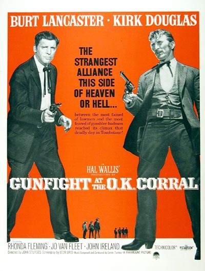 Dirección: John Sturges. Guión: Leon Uris, inspirado en un artículo de John Scullin. Fotografía: Charles Lang. Música: Dimitri Tiomkin. Reparto: Burt Lancaster (Wyatt Earp), Kirk Douglas (Doc Holliday), Rhonda Fleming (Laura), Jo Van Fleet (Kate). Dur.: 122 min.