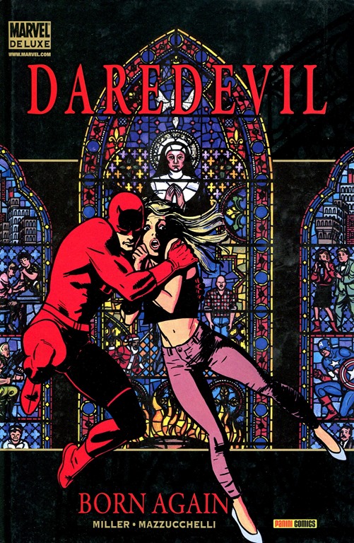 Todas las referencias religiosas que he hecho no son mera casualidad, sino algo completamente meditado, como indican los sucesivos títulos de cada episodio de la saga: Apocalipsis, Purgatorio, ¡Paria!, Nacer otra vez y Salvado. Recuérdese que Frank Miller compartía con Matt Murdock su formación católica. Born Again, se ha comentado hasta la saciedad, es una paráfrasis de la Pasión de Cristo en la persona del superhéroe católico por excelencia del mainstream marvelita. No en vano todo comienza con la presencia de un Judas, la señalada Karen Page, solo que un Judas en busca también de redención, que corre a Nueva York, eludiendo la caza decretada por Kingpin contra cualquiera que conozca la información que él quiere poseer en exclusiva, a reencontrarse con Matt, en busca del perdón. Prosigue con la execración pública: el proceso en que es desposeído de su licencia de abogado sería el equivalente al juicio ante Pilatos. Y concluye con una crucifixión, solo que aquí es inusitadamente larga, pues incluye el intento de asesinato en el Hudson y su larga peregrinación por una Nueva York que, irónicamente, celebra la Navidad, durante la cual recibirá, cómo no, la lanzada (bajo la forma del puñal de Turk), hasta quedar postrado, como muerto.