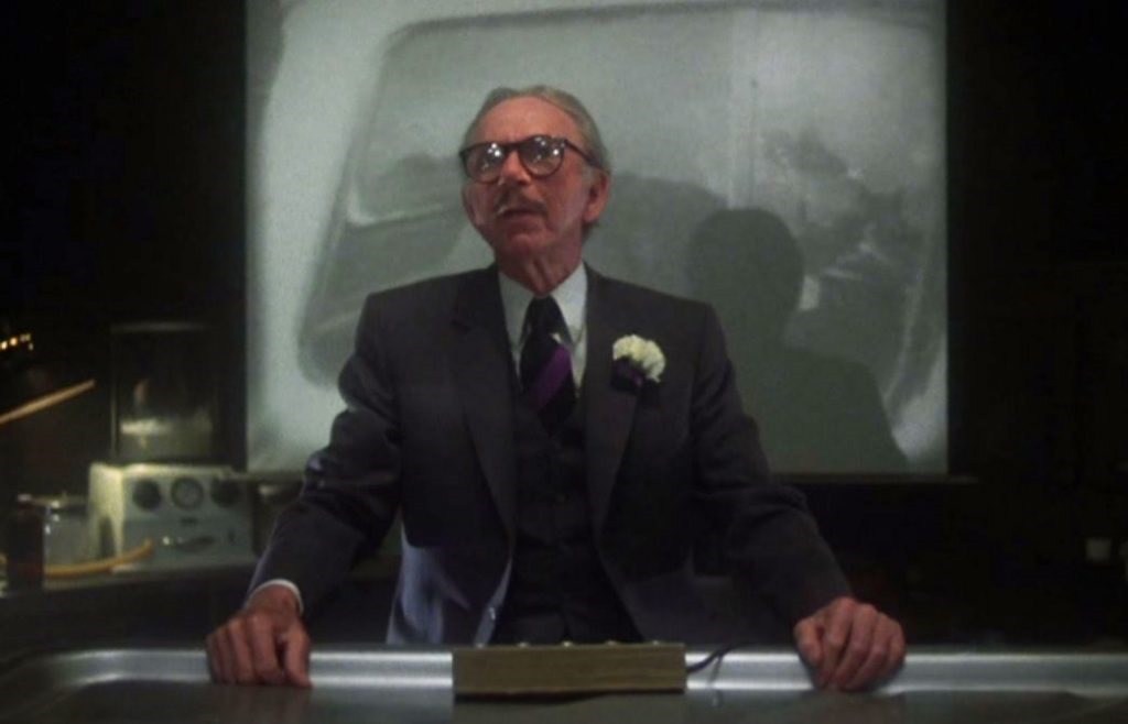 Jack Albertson como el forense Dodds, en Muertos y enterradosEs probable que Muertos y enterrados contenga el villano —en su clásica figura del mad doctor, y volvemos a esa tensión entre ortodoxia y heterodoxia— más terriblemente malsano de la historia del género: William G. Dobbs, el forense del pueblo, pero sobre todo el restaurador de los cadáveres, y por ello y con toda lógica el cerebro que está detrás de los macabros episodios que envuelven el pueblo. Genialmente encarnado por el veterano Jack Albertson, desde su misma caracterización visual (enormes gafas de miope, considerable atildamiento personal, gestos ceremoniosos), Dobbs es un artista de la reconstrucción facial que, en su locura, ha acabado convencido de que la única forma de derrotar a la degradación en que degenera toda vida es salvaguardando la apariencia en la muerte. Dobbs se ha construido su particular paraíso de vida en la muerte (retorcido a la medida de su locura) en el aislado y pequeño Potters Bluff, que además le permite seguir practicando ese arte de la reconstrucción plástica —de la resurrección— en que se sabe genial: una magnífica escena previa que ya no debiera dejar lugar a dudas sobre su papel en los asesinatos es el espléndido momento en que, mediante un sencillo encadenado de planos cenitales, lo vemos restaurar por completo el rostro de una excursionista que fue muerta a pedradas.