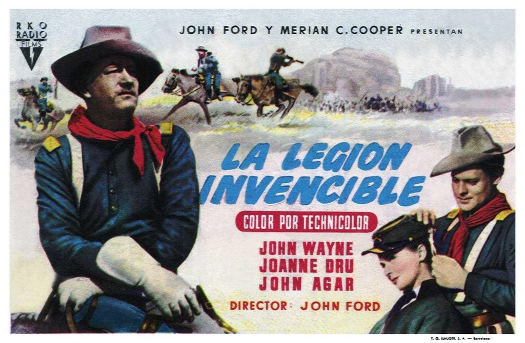 John Wayne y Joanne Dru en La legion invenciblePara su siguiente film, La legión invencible (1949), Ford compró dos relatos de Bellah, Comando y Partida de guerra, aunque (como deja bien claro su inclusión en el volumen de Valdemar) también aprovecha elementos de un tercero, La gran cacería. El protagonista de los dos primeros relatos es el capitán Nathan Brittles, el personaje que interpretará John Wayne en su adaptación. La película, recuérdese, narra los últimos días de servicio de este oficial, destinado en el lejano Fort Starke. Ford vincula su película con la anterior Fort Apache, al remarcar en la narración con que se abre la película que se acaba de producir la derrota del general Custer (ahora ya de modo abierto), lo cual ha puesto en pie de guerra a todas las tribus indias del Oeste. El núcleo del guion está extraído de Partida de guerra, el cuento que narra la crónica no de los últimos días de servicio de Brittles, sino tan solo de su último día, y en él reside la brillante idea (y que parece muy poco propia de unas historias y unos autores con esa fama de reaccionarios) de abortar la contienda antes de que llegue siquiera a estallar, al atacar por sorpresa el campamento indio y poner en estampida sus preciosos caballos, sin los cuales a los pieles rojas solo les queda la humillación de regresar a pie a sus reservas.