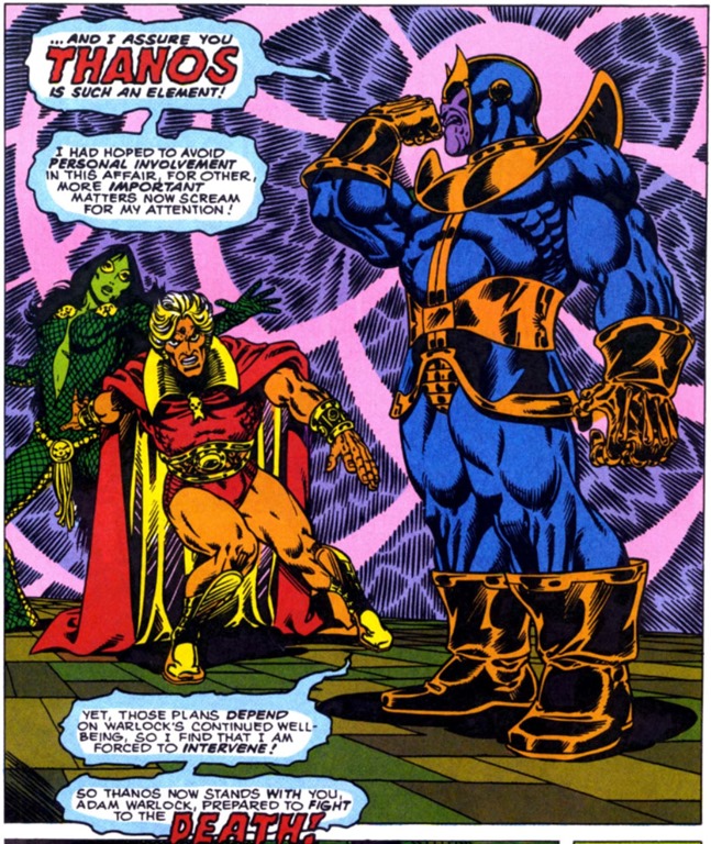 En el curso de su lucha mortal contra el Magus, Warlock recibirá una inapreciable ayuda de nada menos que… Thanos. ¿El Titán Loco convertido en un agente del bien? Por supuesto, sus motivaciones son tan particulares como ambiguas: si Thanos desea parar los pies al poderoso Magus es porque sabe que este, irónicamente, en su apasionada perversidad, es un campeón del concepto al que tanto combate, la Vida. En este ingenioso reaprovechamiento de su villano, Starlin deja bien claro que lo considera su creación fundamental, no en vano durante cerca de dos décadas puede decirse que prácticamente ningún otro autor de Marvel pondría sus manos en él.