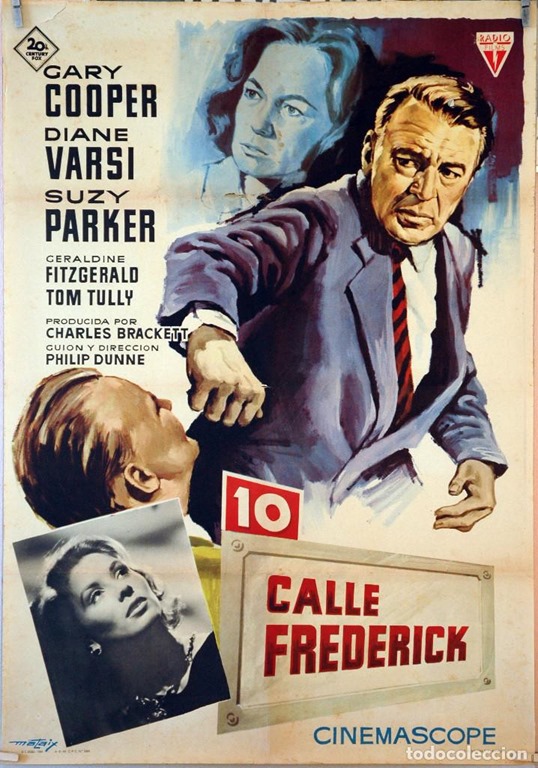 Cartel de 10, calle FrederickComienzo esta crónica crepuscular con uno de los títulos más olvidados de su trayectoria: 10, calle Frederick (1958), un melodrama dirigido por el que fuera uno de los grandes guionistas de Hollywood, Philip Dunne (¡Qué verde era mi valle!, El fantasma y la señora Muir). Tal vez no extrañe que tan poca gente recuerde este film: por inaudito que parezca, Cooper encarna a un hombre de próspera situación económica, que cuando creer hallarse en la cúspide de su vida (el film arranca en momento tan emblemático como la celebración del día en que cumple 50 años), inicia una decadencia irreversible tanto en el ámbito público como en el privado. En el primero, su intento de iniciar una carrera política se salda con la enorme humillación de descubrir que quienes parecían promocionarlo solo querían arrancarle una donación generosa para luego incitarlo a retirarse, pues lo consideran carente de cualquier carisma para sus pretensiones. En el segundo, su vida familiar se convierte en un desastre: manejado por su ambiciosa esposa (que es la que lo ha empujado al ruedo político y teme, por tanto, cualquier posibilidad de escándalo privado), arruina el futuro de sus dos vástagos: la carrera de bellas artes que quería iniciar el hijo, lejos de la tradición familiar en el mundo del derecho, y el matrimonio de su hija con un músico del que había quedado embarazada (lo que, además, le provoca el aborto). Y todo para nada, porque lo que le queda al final es la confirmación del desprecio de su esposa, una vez que esta comprueba lo que seguramente ya sabía (que era un perdedor), y el abandono de sus decepcionados hijos, que tanto confiaban en él, siendo el más doloroso el de la muchacha, su auténtico ojito derecho.