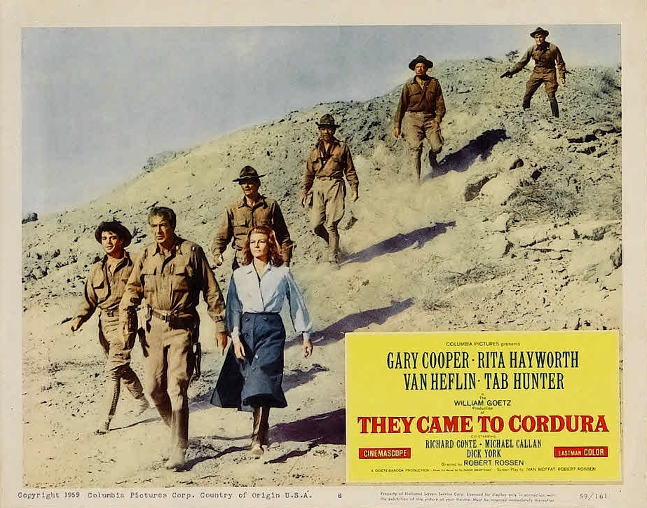 Llegaron a CorduraEn el siguiente film, They Come to Cordura (1958) —nunca estrenado en España, pero emitido por tv bajo el título de Llegaron a Cordura, que cambia de modo absurdo el tiempo verbal—, el actor volvió a aceptar un impensable papel de fracasado. Cooper interpreta a un militar, el comandante Thorn, que ha cometido la cobardía de esconderse en una zanja mientras las tropas de Pancho Villa hacían una incursión en territorio estadounidense. Sin embargo, sus superiores han encubierto esa lacra, contentándose con apartarlo de la primera línea en la subsiguiente incursión de represalia en México: lo han nombrado oficial de condecoraciones (es decir, en batalla ha de permanecer en retaguardia para observar atentamente la marcha del combate y luego proponer para la famosa medalla del Congreso a los soldados que han luchado más allá del mero cumplimiento del deber). El planteamiento, por tanto, es prometedor: un cobarde se convierte en el encargado de decidir quién es un héroe. Es más, Thorn aprovechará esa función —y el viaje subsiguiente de regreso a la base de partida, un pueblo llamado (¿simbólicamente?) Cordura, en compañía de los soldados señalados, trayecto lleno de peligros que sustenta el meollo de la trama— para interrogarlos minuciosamente, con la excusa del informe en que debe justificar su concesión, acerca de sus sentimientos y motivaciones mientras realizaban su comportamiento heroico, tratando de comprender por qué él mismo, en una situación similar, falló.