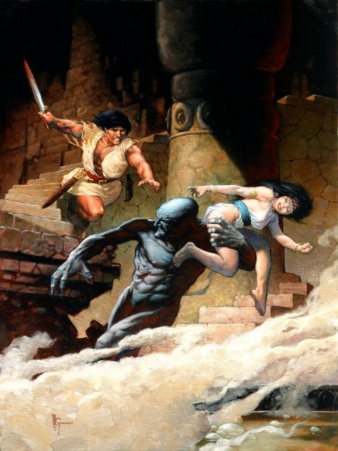 Porque para tu información Sombras de Hierro a la luz de la luna fue la aventura canonica Howardiana con la que el Cimeriano mas querido de las historias -la de el y la nuestra -hizo su regreso apoteosico al panorama comiqueril aca de este lado del charco, precisamente al ladito sur de la nación de Howard. Traida a nosotros por la ya extinta Novedades Editores, el numero uno de La Espada Salvaje de Conan nos presentó este relato en maravilloso blanco y negro con dos factores claves que sirvieron de gancho a los fanboys que solo estaban habituados a las mallas, capas y capuchas del mainstream DC & Marvel. El primero, la portada de Boris Vallejo con lo cual era poco menos que imposible que la chamacada que oscilaba entre los doce y dieciseis años no cayera presa de la curiosidad aderezada con mucho morbo ante semejante presentación, a saber, en la saliente de una colina montañosa con una vasta cordillera como telon de fondo y que cualquiera que haya leido El Sillmarillion de Tolkien podría confundir con las montañas de la Sombra, estan liados a muerte un sujeto musculoso con el torso desnudo y sudoroso encaramado a la espalda de un montruoso ente que pareciera tallado en piedra mientras intenta desesperadamente y con furia reventarlo con arma punzocortante que porta en mano, mientras detras de los contrincantes observa presa de angustia y terror una damisela semidesnuda que da la impresión de que sera el botin de batalla para el ganador. El otro factor y que no desmerece al primero, mas bien lo complementa y lo realza, es el arte en el dibujo y la narración de Alfredo Alcala, no se pero creo que este tipo nunca lucio tan bien como cuando trabajo contandonos las aventuras del cimeriano, da la impresión de que mejoraba las indicaciones que Roy Thomas le entregaba en el guion y en un ligero acceso de clarividencia no veo ni por donde puedan conseguir dibujantes de este talento para la nueva corrida del cimeriano en su tan anunciado regreso a casa.